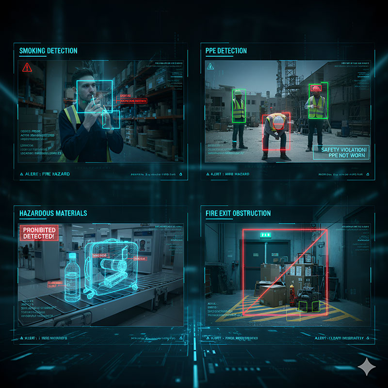 我们提供一系列针对特定风险、安全与合规性的定制化AI算法服务,旨在填补通用解决方案的空白,为您的特殊业务场景提供精确的智能监控支持。如抽烟检测、烟火检测、消防通道堵塞检测、危险品检测、工作服检测、安全帽检测等。